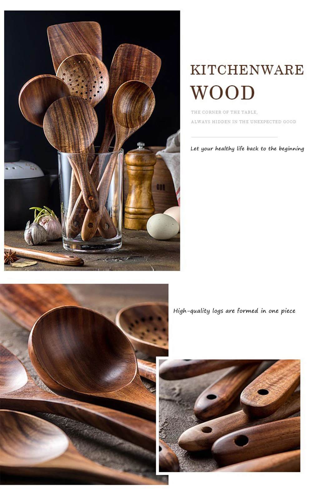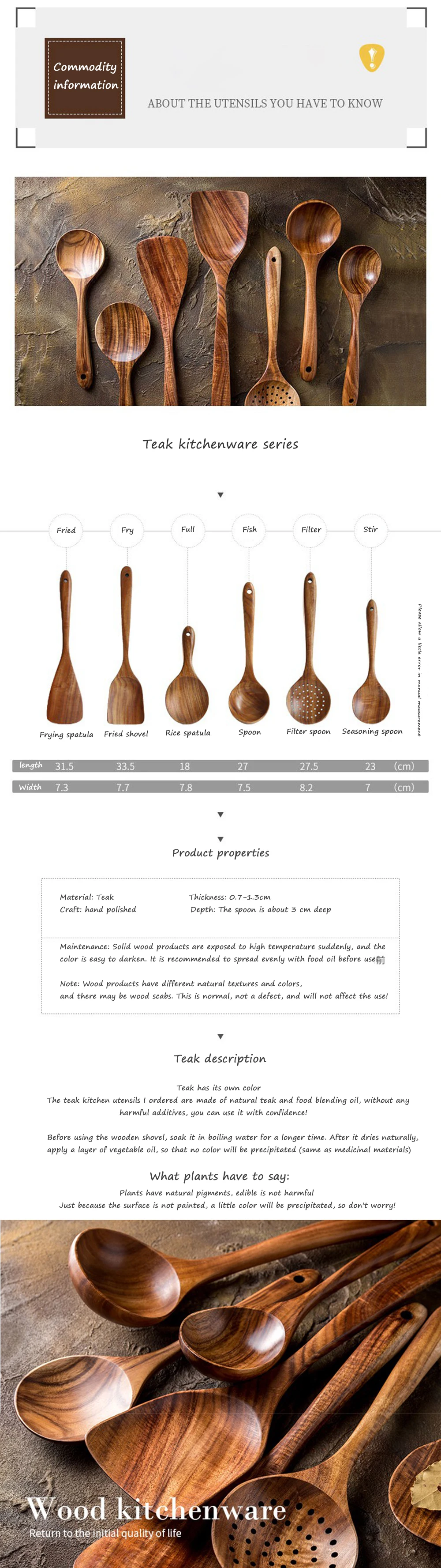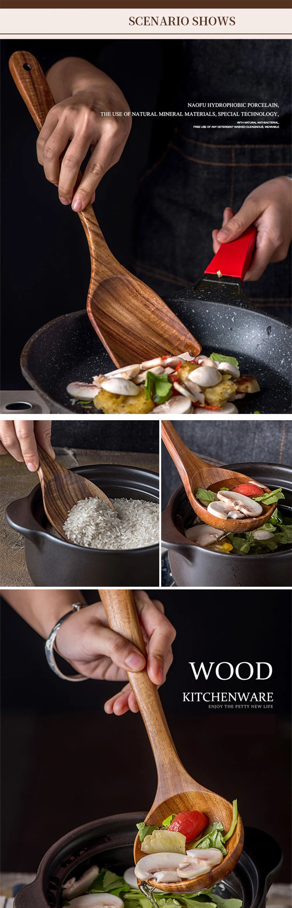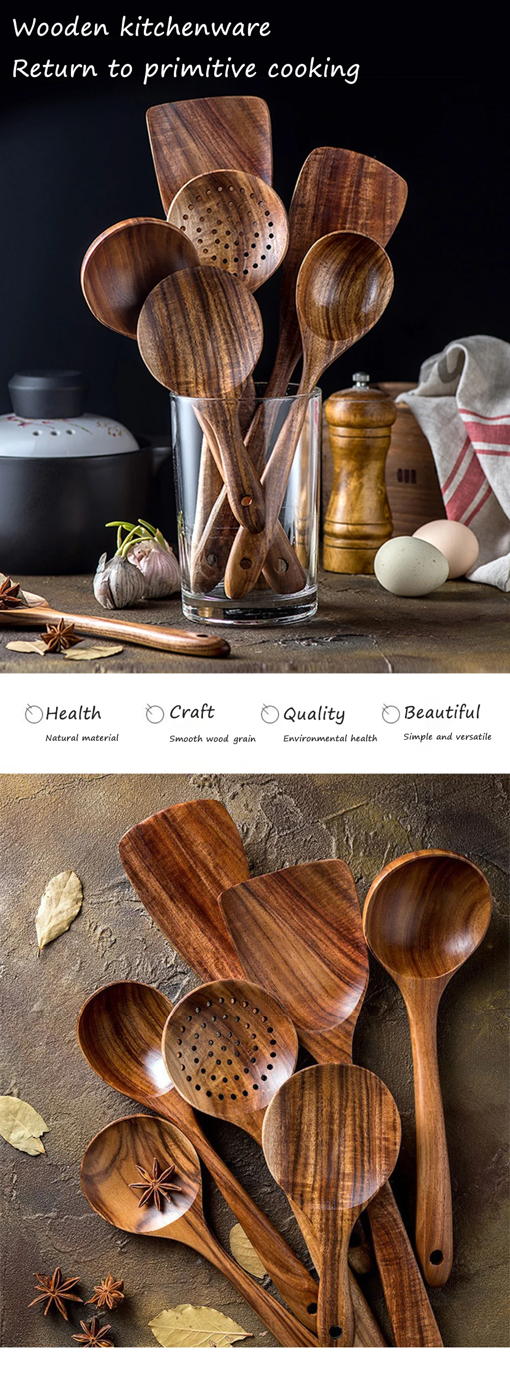Teak Natural Wood Cookware Kitchen Utensils Cooking Tools Sets Tableware Kitchenware Dinnerware Spoon Shovel Colander Wooden Kit
